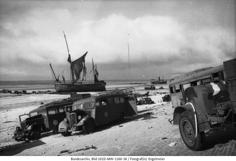 ダンケルクの東側に広がる海岸線の砂浜の状況(写真の説明文では5月撮影となっているが6月の誤りだと思われる。5月中の段階でドイツ軍はこの海岸線までは到達していない)。後で見るように撤退戦開始直前と直後に港湾施設がほぼ破壊されてしまったため、この東側の砂浜からも撤収が行われました。奥に見えている船は砂浜の兵員を救出するために海岸線に近づき過ぎて座礁したか、ドイツ軍の砲撃、爆撃で損傷して放棄されたものだと思います。手前のバスはシトロエンなので、恐らくこの一帯からはフランス軍が撤退したようです。無数の装備が散乱していますが、破壊、焼却がなされていないものも多く、慌てて撤退したのが見て取れます。