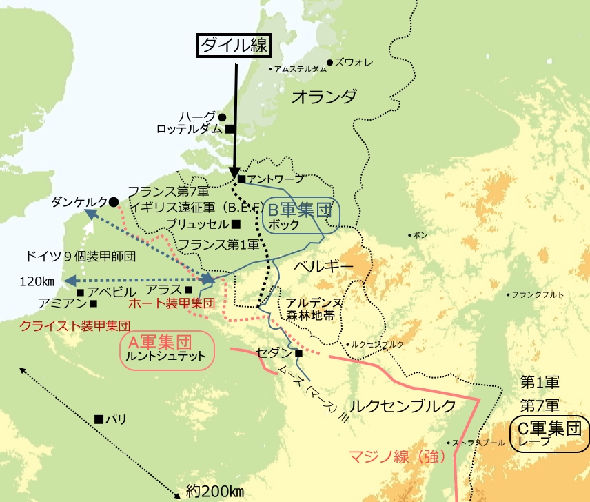 何度か指摘したようにベルギー南部からフランス国境付近までは緩やかな高地(黄色の地形)で、大規模な軍隊の移動には向きません。このためブリュッセル周辺に展開する連合軍主力は、自分たちが入って来たのと同じ場所、アラスからダンケルクを結ぶ平地の入り口からフランス本土に撤退するしか無いのです。その入り口はざっと120q幅しかなく、ここにドイツ9個装甲師団が殺到した結果、まさに水も漏らさぬ強固な包囲網が完成してしまったのです。