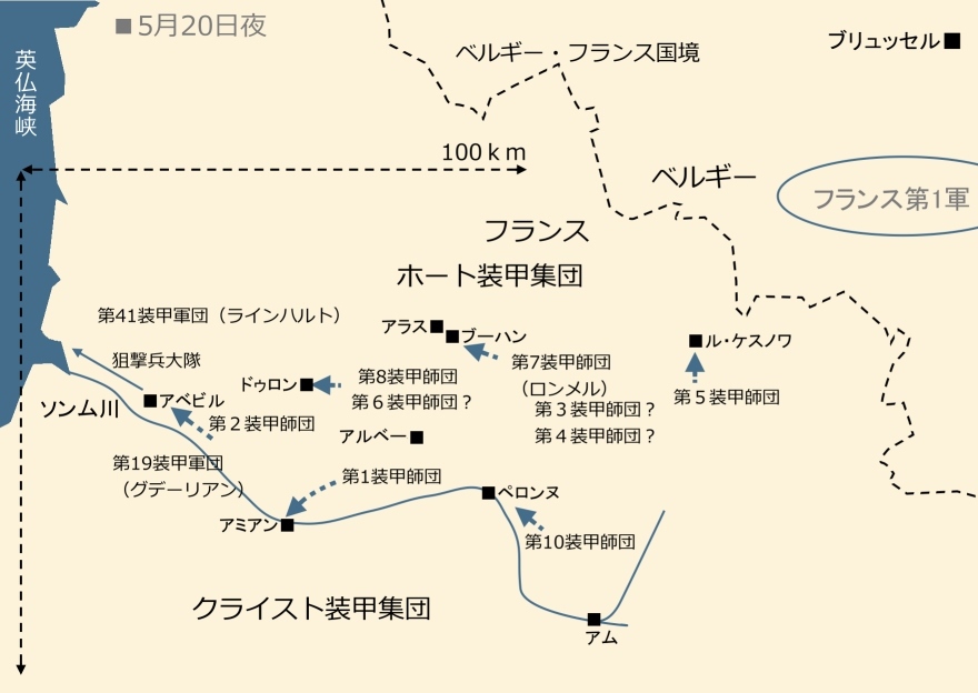 そこからほぼ二日後の状況が以下の地図です。注目はソンム川沿いのグデーリアンの第19装甲軍団の快進撃でしょう。ソンム川を盾に南方からのフランス軍の反撃を防ぐ形で進撃、さらに第2装甲師団が途中から先行します。この結果、20日夜の段階で河口近くの都市、アベビル(Abbeville)に同師団は到達、さらに機械化歩兵からなる一個狙撃兵大隊を海峡部に送り出し、この日についに英仏海峡に到達しています。すなわち、ベルギー北部の平野部に展開する、連合軍主力の脱出口を塞ぐのに成功したのです。