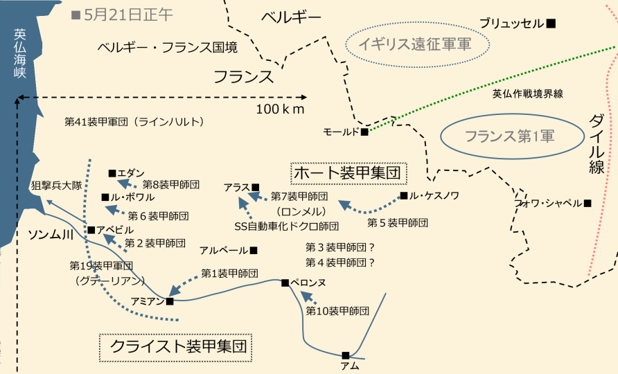 Boisle)まで進出、その南のアベビルに進出していた第2装甲師団と合わせ、すでに英仏海峡から30q、半日もあれば到達できる距離に装甲三個師団による強力な前線が構築されたのです。さらにそこからソンム川沿いのアミアンに居る第1装甲師団までがクライスト装甲集団による最前線となります(既に第2装甲師団の一部が海岸線に進出しているので連合軍主力の封鎖線は完成済みと考えていい)。