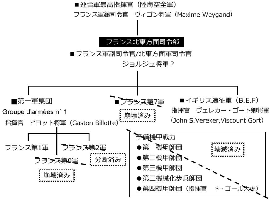 ここで再度、電撃戦開始時の連合軍側の指揮系統を確認して置きましょう。ちなみにベルギー軍は独立した指揮系統を持っており、フランス軍とは連絡を取りながらも、完全な指揮下には置かれていなかったようです。