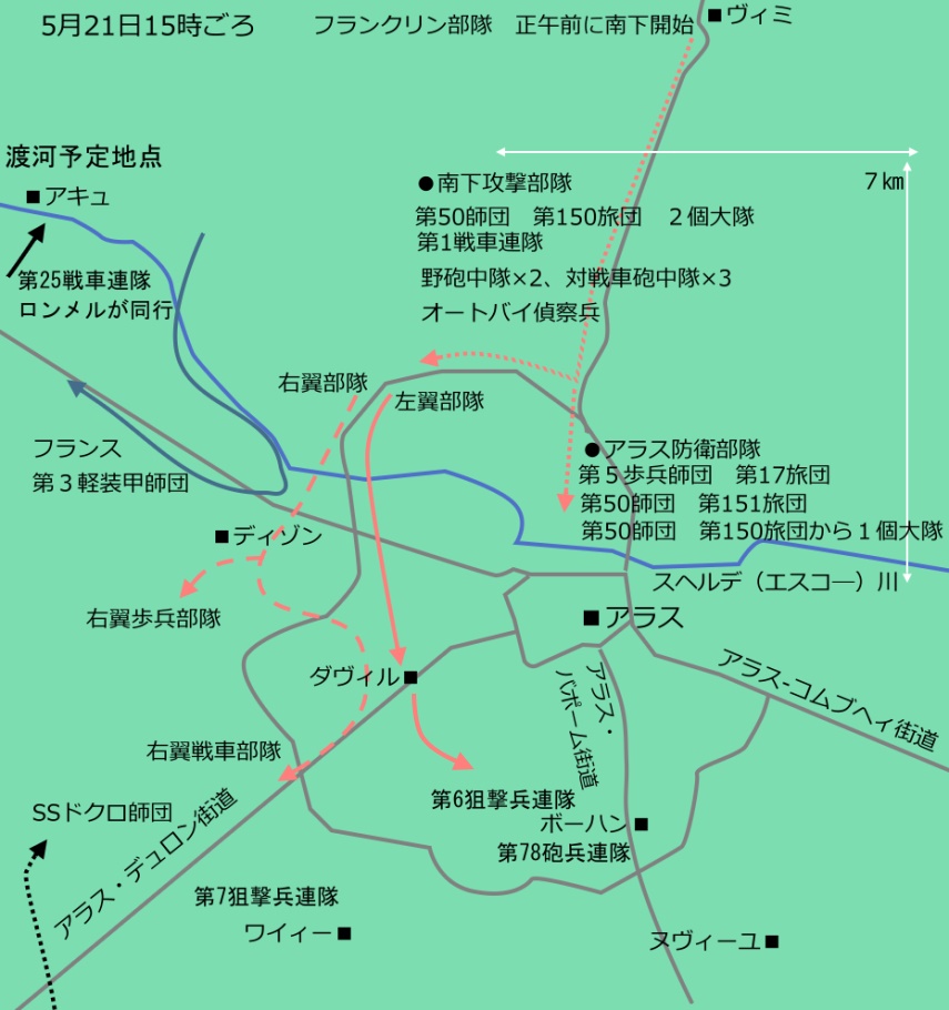 この時、ロンメルはアラスの街を挟んで死角となる北東方向から南下中の連合軍部隊に全く気付いてませんでした。この辺りは少しでも偵察を出して置けば発見できたはずで、奇襲を許したのはロンメルの油断でしょう(この点はSSドクロ師団も同罪だが、本来アラスの街周辺はロンメルの第7装甲師団の担当だった。さらに戦闘経験の無い素人部隊であり同情の余地はある)。