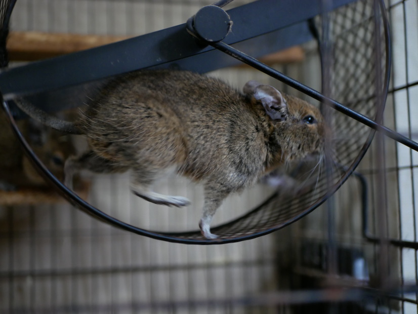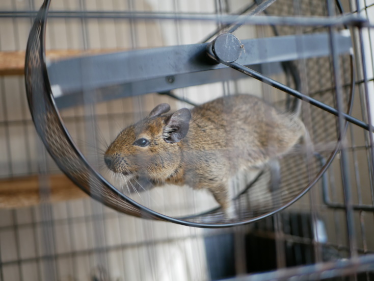 回し車を全力疾走中のデグーは難しい被写体の一つ。素早いのでシャッター速度を上げないとなんですが、室内では限度があり、日差しが深く入る秋冬の午前中にしか撮影不可能な貴重な写真となっております。