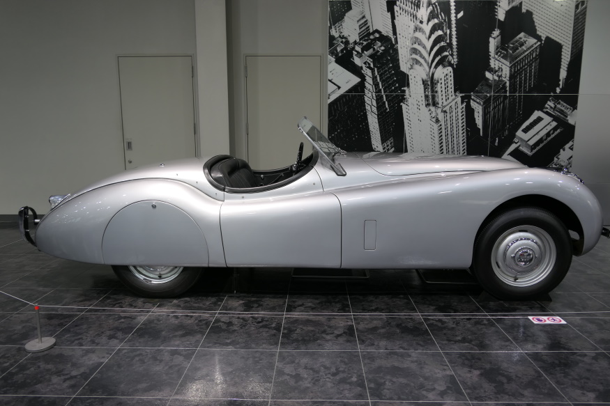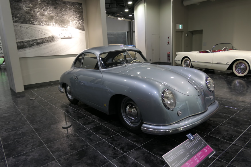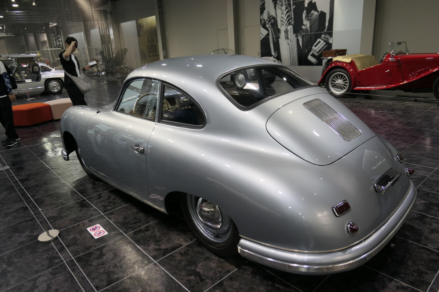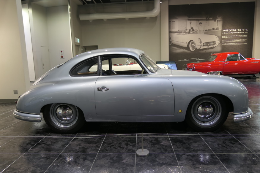 ![]() ジャガー XK120(Jaguar XK120)、1951年型。 1948年発売のイギリス、ジャガー社による戦後最初のスポーツカー。当初は1948年のロンドンモーターショーに展示されたエンジン技術デモのための車だったのですが、発表された途端にそのデザインで大きな話題となり、そのまま発売される事になったそうな。1万2千台が製造され、この手の車としてはそれなりのヒット作となっています。これも多くがアメリカに輸出されたようです。こちらは左ハンドル仕様もあり。 ちなみにジャガーが高級車メーカーなのは事実ですが、そのスポーツカーは比較的安価なのが人気の理由の一つでした。そこそこ安くて速くてカッコいい車がジャガーのスポーツカーなのです。この辺りは後に日産のフェアレディZが同じような理由でヒット作になるのですが。 エンジンは3441cc、DOHCの直列6気筒のXK16型で、これをフロントに置いての後輪駆動(FR)でした。ちなみに数字の120はヨーロッパ車でお馴染み税制の数字では無く、最高速度の時速120マイル(192km/h)を意味します。当時の市販車では世界最速の速度でした(ちなみにギア比と風防ガラスだけを変えた記録用車両では210km/hを出している)。型番のXKは搭載したエンジンの名称で、当初はこのエンジンをテストするための試験用車両&デモ車両として設計されたためだと思います。ちなみにXKエンジンは基本設計を残したまま、排気量を上げる形で後々までジャガー社の車に搭載され続けました。 初期に生産された242台は木製フレームにアルミの外板を貼った手作業で造られる車体で、途中から量産が効くプレス製の全鋼製シャシ―に交換されたとか。まあイギリスは大戦中に木製の双発エンジン戦闘機、モスキートを造っていた国ではあるのですが、凄い話ですね。 ![]() 展示の車両は1951年型との事なので鋼製のフレームになった後の車両です。これはオープン型ですが屋根付きのクーペもありました。 脚回りはフロントにトーションバー サスペンションを採用しており(垂直に伸び縮みするのでは無く、横置きされたバネのねじり抵抗を利用したサスペンション。ネズミ捕りなどの罠に使われている横置きのバネと同じ原理。戦車では捩じってない金属棒の左右を抑えてバネ替わりにする事も多い。このためバネ定数ではなく、ねじり定数に基づき作用する)、これは後のヒット作、E型のフロントでも踏襲されます。スポーツカーが戦車式のサスペンションかよと思っちゃう所ですが、この時代でそれなりの数の採用例があります(同じ英国のモリス社、アメリカのパッカード社などが採用している)。ただまあ、スポーツカーに向いた構造では無い気がしますけど… 全体的に流線形の美しい形状ではあるんですが、個人的にはナメクジみたいという印象で好き車ではな無いです。ヘッドライト周りのデザインとかも戦前の流行りから抜け出せてないな、という印象ですし。 ![]() ポルシェ 356(Porsche 356) 1100 の1950年型。 ポルシェ社のデビュー作となるスポーツカーであり、1948年に発売開始となったのがこの356です。後に911にまで引き継がれる、水平対向空冷エンジンを車体後部に搭載した後輪駆動(RR)の構造を持つスポーツカーでした。まあ、ぶっちゃけフォルクスワーゲンの設計思想をそのまま引き継いでるんですけどね、この辺りは。設計に関してはフェルディナント・ポルシェ博士は一切関係していませんが、サスペンションやエンジン収納部はフォルクスワーゲンから流用された設計のものが使用されています。実際、当初はフォルクスワーゲンの部品をそのまんま使っていたようです。 365は1965年、走る伝説911のデビュー直後までエンジン排気量を引き上げながら製造が続きました。当初はこの1100ccが投入され、1951年から1300ccと1500ccエンジンが搭載されるようになります。さらに1955年に二代目のA型が発売になると1600ccが追加となり、1960年に登場する三代目のB型では2000ccが追加となりました。ちなみに最終世代、1964年から65年まで、わずかに二年間だけの生産で終わった四代目のC型ではエンジン排気量の拡大は無しです。 余談ながらポルシェの1948年の会社設立時の名称はDr. Ing. h.c. F. Porsche AGではなく、Porsche Konstruktionen GesmbH でした。これは戦後、戦勝国による財産没収などを回避する目的で、当初はオーストリアで会社を設立、その後、1950年に西ドイツに改めて移転した後に社名を変更したためです。なので資料によっては当初、別会社によって生産されたと述べられていますが、実際は名称変更しただけで同じ会社と考えていいでしょう。このため、1948年のデビュー当初はオーストリアで生産され、1950年から西ドイツの工場に移転しています。ちなみに最終的には7万6300台を生産する大ヒットとなるのですが、売れまくるのは二代目、1955年デビューのA型以降で、初代の無印356は7年間で7600台しか製造されていません(内、最初の50台だけがオーストリア製)。これまたトヨタ博物館、よくぞ手に入れたなあ、と