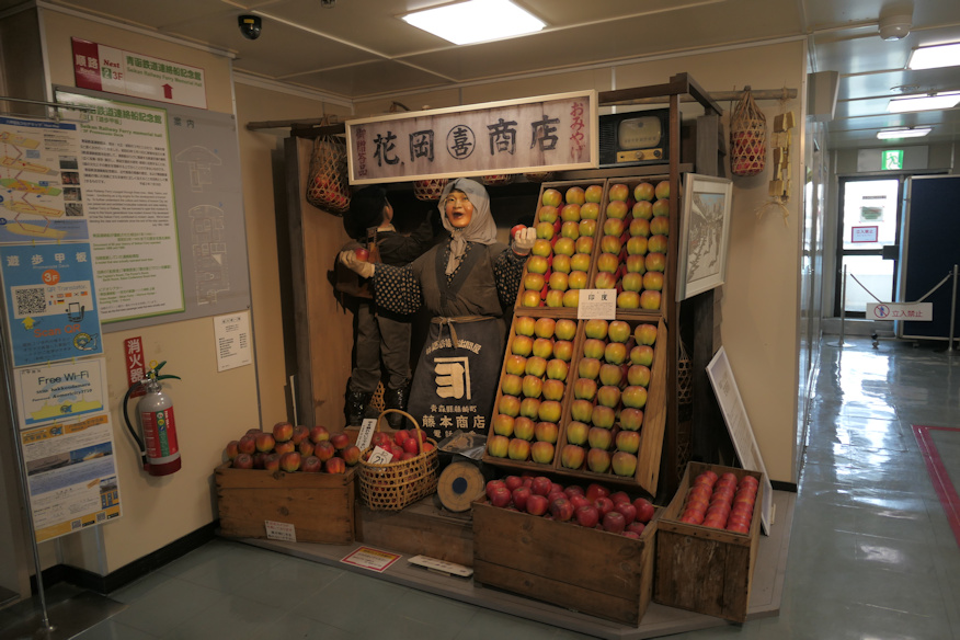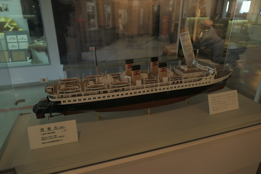 |  先に述べたように普通客室があった二階はイベントホールに改造されてしまって見学不可なので、まずはグリーン&寝台室があった三階へ向かうのが順路のようです。  あああああああ、これもダメか。改造されまくってる。そしてなぜか入り口ではYS-11の写真展をやってました。…いや、なんで?  そして突然筆者を襲うトラウマ。ぬおおおおお、これ、船の科学館の羊蹄丸にいたリンゴ屋さんだ。あああああ、もう二度と会う事は無いと思ったのに。八甲田丸よ、お前もかと泣きたくなったのですが、幸いにしてこの展示は一部が移転されたのみでした。  まあ、グリーン室はブチ抜きで展示室に改造されちゃってて、ちょっとガッカリですが当時の雰囲気は残っています。  でもってここも船の模型が置かれており、これまた若干吐き気がしましたが、幸いにして青函連絡船関連ばかりで、精神的には落ち着いて見られました。でもってこれ、よく見れば洞爺丸だ。よりによって何でまた…。 言うまでも無く、1954(昭和29)年9月26日夜、台風による荒天化の出航で転覆、1155人の死者を出した洞爺丸事件の船です。後ろからの写真を撮り忘れましたが、この世代まで鉄道車両甲板には密閉する扉が無く、海上で解放されたまま運行されていました。ここからの浸水が沈没の主要因となり、以後の青函連絡船では扉が設けられる事になるのです(浸水した上に艦底の機関室に海水が大量に流れ込み機関停止を引き起こした。これで推力が失われた上に排水ポンプの動力も失ってしまう。やたらと開口部が多い未だ石炭ボイラー機関だったのも不運だった)。 この点、洞爺丸の転覆が有名過ぎて見落とされがちですが、この時、戦後に復興された(後述)青函連絡船6隻の内、洞爺丸を含む5隻が失われ、残り4隻では乗務員275人の犠牲者を出しています。すなわち一晩で1430人が同一海域(全て函館港外)で亡くなり、しかも大雪丸を除く全ての青函連絡船が沈む、という大惨事となっていたのです。ほぼ全滅と言っていい状況です。その後、急造された2隻が一年後の1955(昭和30)年9月に就航、台風後、引き上げ修復された2隻が1956(昭和31)年4月と8月に復帰、5隻体制が整うのですが、少なくとも一年近く大雪丸一隻しか無かったはず。どうやって切りまわしていたのか気になったのですが、ちょっと調べてただけではよく判りませんでした。 ちなみに青函連絡船が壊滅したのはこれが二度目でした。わずか9年前、第二次大戦時末期の1945(昭和20)年7月14日に青函連絡船団12隻は米軍から空襲を受け、一度既に壊滅していたのです(沈没7隻、航行不能4隻。唯一残った1隻も翌日沈められた。死者352名。損失12隻。国鉄青函連絡船は全滅した)。この内、比較的損失が軽微だった2隻は7月中に復帰するものの、以後、洞爺丸など戦後世代の青函連絡船が就航する戦後1947(昭和22)年まで、わずか2隻での運用が続いていたのです。それがようやく解決した後、僅か7年で再度壊滅しているわけで、これほど凄まじい経歴を持つ定期船航路は世界的にも珍しいと思われます。 |