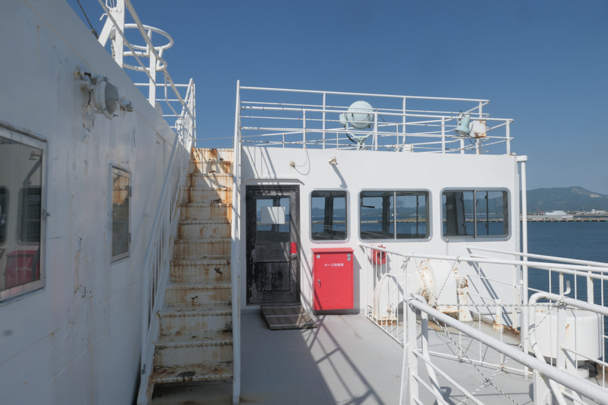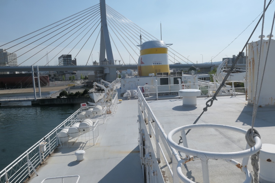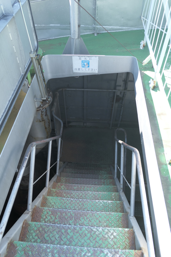![]() 大満足。撤退としましょう。 ![]() では操舵室に戻しましょう。…ってあれ、操舵室の上にも登れるじゃん。これは行かねば。 ![]() そこからの眺め。手前に見えているのは青森港の北側の防波堤。よく見ると人が歩いてるので、後で行って見ましょうか。 ![]() 後方の眺め。煙突までの距離からしてやはり大型船だなあ、と思う。ちなみに私がかつて航海中に乗った最大の船は伊豆諸島に向かう「さるびあ丸」で、あれも大きいな、と思ったんですが全長118m、この八甲田丸は132mとさらに大きいのでした。まあ外洋に出る船ですからね。 ![]() さて、お次はいよいよ車両甲板。操舵室横のエレベータで降りるようです。ただし当時の図面を見るとここには階段しか無いはずで、展示施設になってから増設されたものの可能性高し。ついでにちょっとアメリカの空母で飛行甲板に出る経路を思い出す。 |