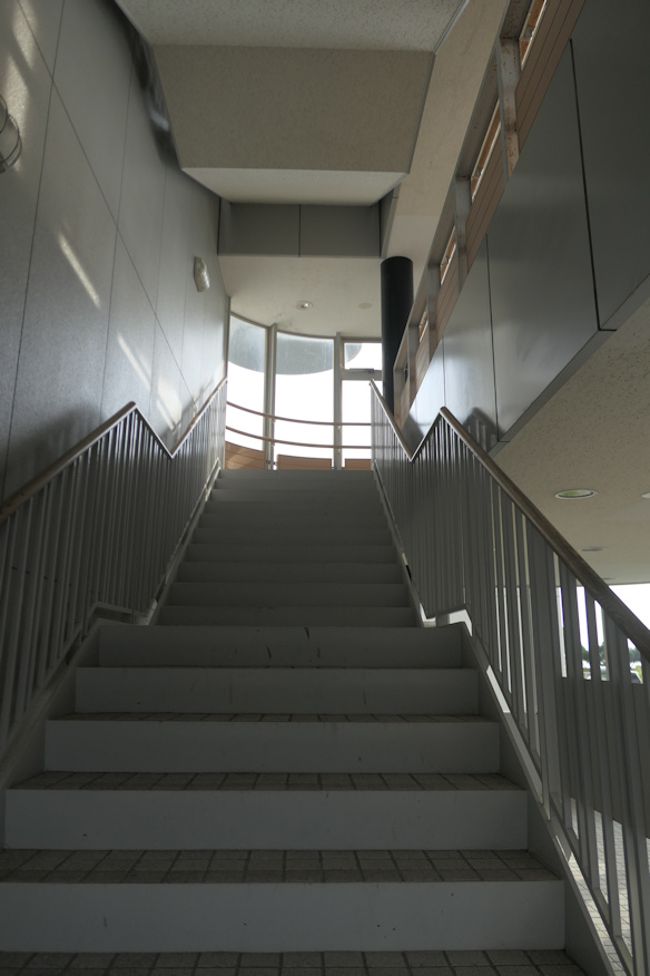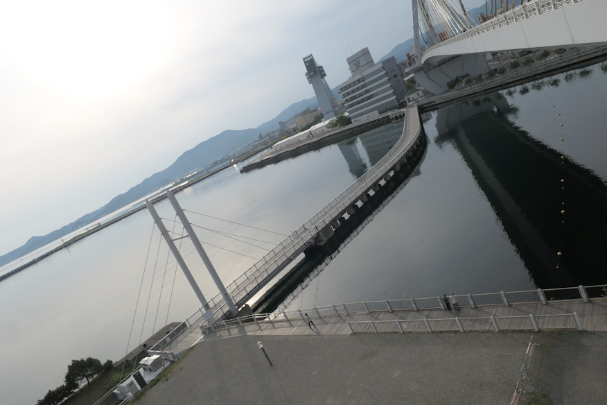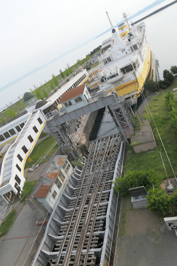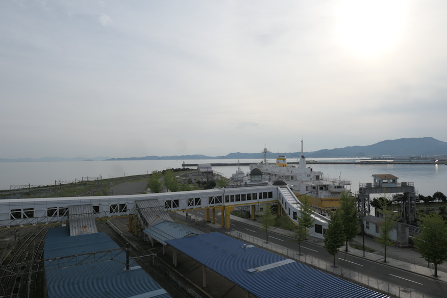 ![]() エレベータとか軟弱な設備は無し。ちなみに冬季は封鎖されるみたいです。 ![]() 上に出ました。おお、思ったより眺めはいい感じ。先ほど渡った歩道橋が見えます。そしてたった今、その名を確認したら青森ラブリッジでした。調べなきゃいつまでも幸せでいられたのにと心底思いました。 ![]() 青函連絡船とその搭載橋を上から見れる。チョーステキ。手前の線路は固定されておらず、潮位や波に合わせて上下するのが見て取れます。 ![]() 西の津軽半島方面を見る。意外に山が多いのね。でもってその山の下に現在の青函連絡船、カーフェリーが見えてます。まあ車が優先ですから、駅からはかなり離れた場所です。いやでも国道や高速道路が通っているという訳でも無いので、もう少し駅の近くへ港造れたんじゃないか、という気はします。いろいろ事情はあるんでしょうが。 ちなみに調べてみたら函館までの所用時間は4時間。ダンケルクの奇跡、ダイナモ作戦の撤退時、フランスから最短距離でイギリスに渡る航路は民間船でも2時間ほどだった、という事を考えると、津軽海峡はすげえな、と思う。 ![]() 少し橋の上を歩いてみる。この辺りがちょうど青森駅の真上ですね。ホームの屋根が意外に普通で、これで雪対策大丈夫なんだ、と思う。 |
