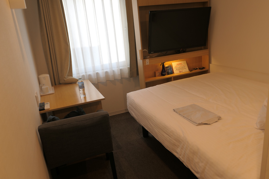 格安キャンペーンで取った部屋なので、窓の外は隣のビルの壁でした。フフフ、慣れてるよ、こういうの。どうせ寝るだけだしね。