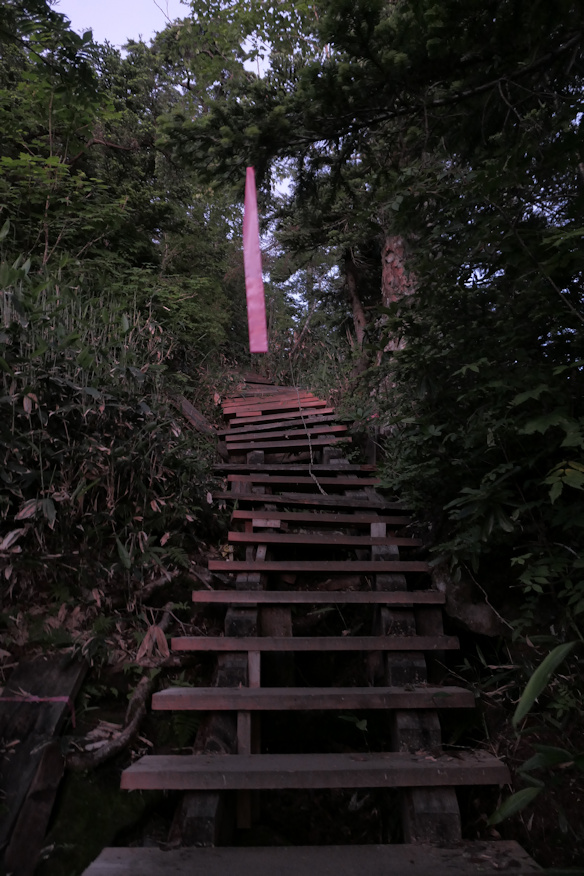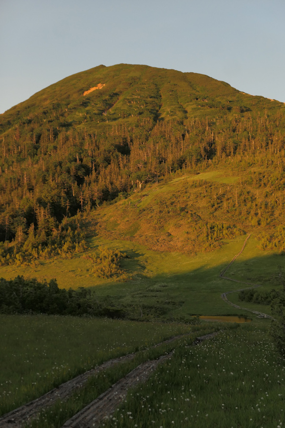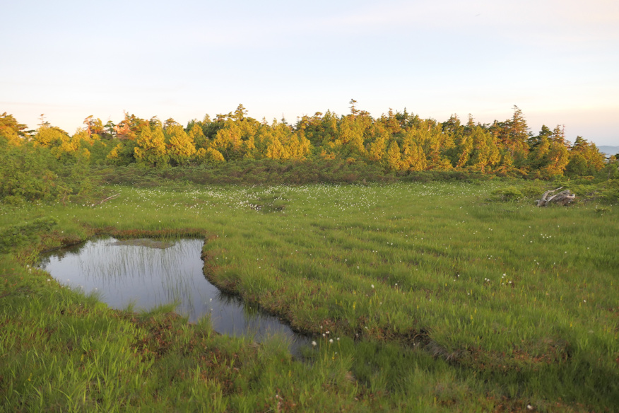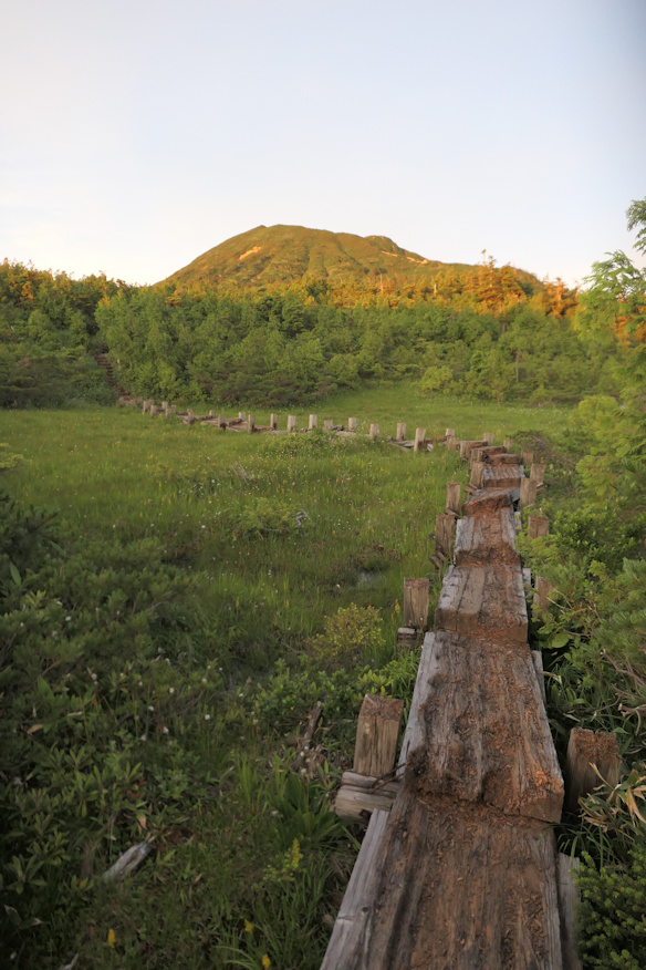 ![]() どんどん高度を稼ぐ。気分はいいけど、疲労も凄いです。これまた中級者以上の経路だったなとここで気が付くがもう遅い。 広沢田代がもうあんなに小さいですね。でもって画面左側に小さい緑の広場が見えてますが、あれも田代で、恐らく御池ロッジ横にある御池田代でしょう。この一帯はこういった小さい湿原が点在している不思議な地域なんですよね。これは飛騨、木曽、明石、あるいは八ヶ岳という日本の中心部にして登山スキの皆さんが殺到する一帯でも観れない光景です。 ![]() 新しく整備された木製の階段。この維持管理も大変だろうな、地元の皆さんに感謝、と思います。赤いテープは登山道を示すものですが、この道で迷うはずがなく、冬季の雪道用でしょう。ここを冬に登る人が居るのか、と思う。 ![]() しばしの登坂地獄の後、再度尾根筋、やや平らな一帯に出る。ここも樹林が無いので田代の一部でしょう。となるとこの経路で二番目に通過する藤沢田代だと思います。 ![]() ここは湿原なんですが平地ではなく、かなり高低差があります。どうやって出来たんだ、この湿原と再度思いますがやはりよく判らず。ここまで来ると、正面に見えているのは途中の尾根筋ではなく恐らく山頂部。左の一番高い辺りが山頂だと思います。ただし燧ケ岳は柴安ー(しばやすぐら)と俎ー(まないたぐら)二つ山頂があって、あれがどっちなのかは判断付かず(厳密な山頂は標高2356mの柴安の方)。ちなみに下山後に確認したら、俎ーの方でした。 ![]() 周囲には小さい池というか沼が点在しています。この辺りは標高1950mを超え、さらにこの先では2000mを超えているはず。まあ高度的には鬼怒沼山の湿原の方が上ですが、それでもこの高度に湿原があるのか、という驚きはあります。 |