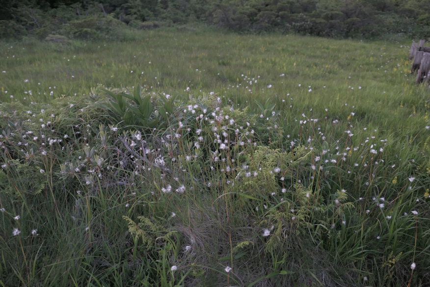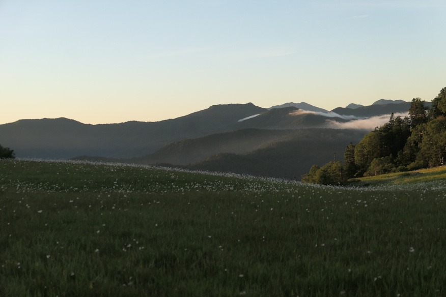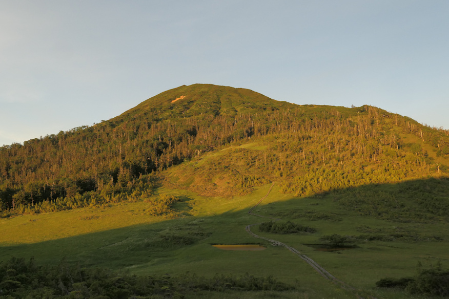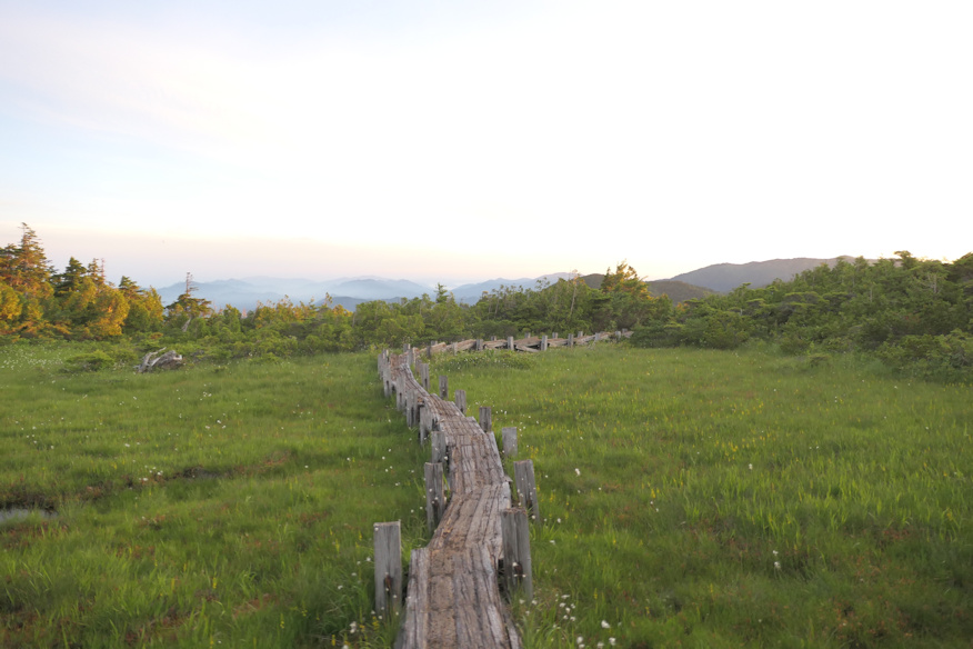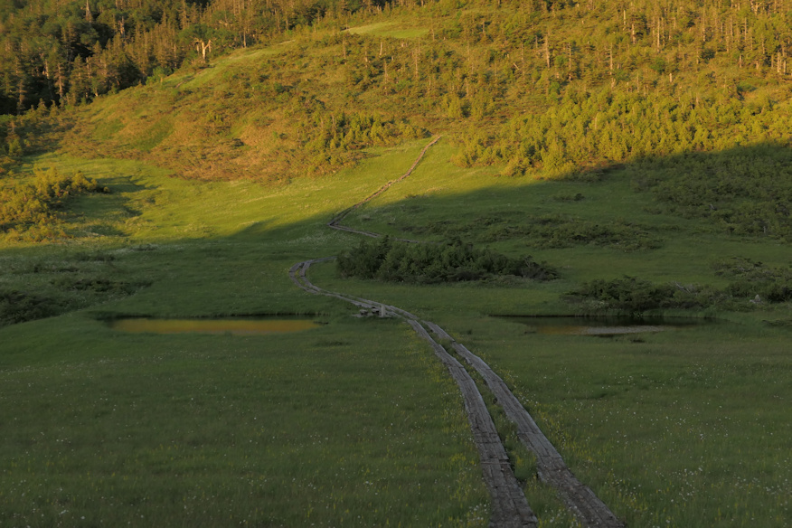![]() この一帯もワタスゲが密生していました。7月中旬まで観れるもんなんですね。 ![]() 木道の先に山脈が広がります。この一帯では最も高い山なので、山頂の下でも周囲の山地は眼下に見下ろす形になるのです。 ![]() 山頂下の湿原の朝。 いやもう美しくて泣きたくなる。私も若いころ、かなりの山を登ったんですが、こんな美しい登山道は初めて。いやはや、世の中はまだまだ知らないことだらけだと改めて思う。世界は美しいのだ。 ![]() この先で木道が二つの池の間をすり抜けるようです。いやもう、おとぎ話の世界でしょう、この光景。もうここから動きたくない、という位の圧倒的な景色でした。 ![]() そこから見えた西側の光景。一番奥の兜のような形状の山は左の山頂が小真名子山、右の山頂が大真名子山だと思います。その右手に男体山もあるはずですが、ここからでは見えず。 |