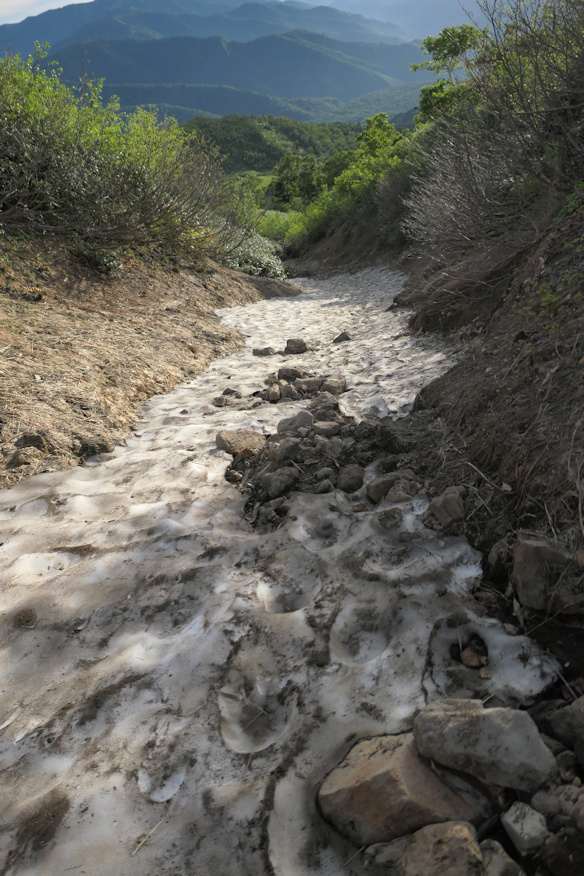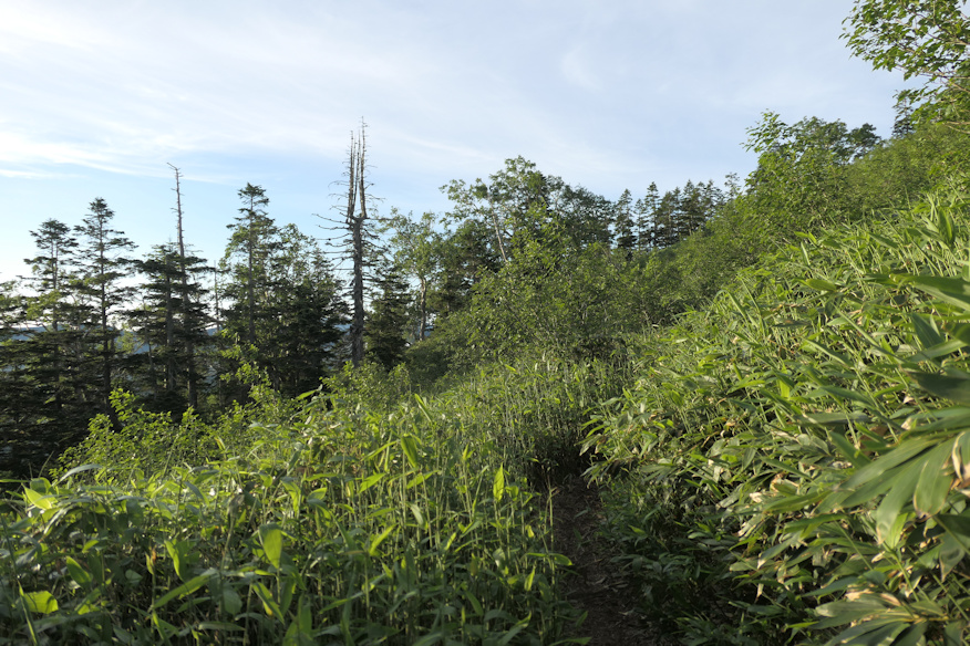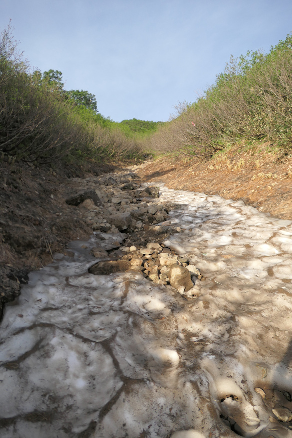 ![]() さて、ではさらなる高みを目指して登坂再開です。この先からは再度地獄の逆直滑降経路で、残る高度差350mを一気に登る事になります。 その途中で見かけた7合目の表示。男体山にも合目表示ありましたが、この一帯の山では普通にあるものなんでしょうかね。あるいは最近の流行りでどこにでもあるのか。昔は全く見た事なかったですけどね、こういった表示。 ![]() 少しずつ、低木林に移行しつつあります。正確に計測した訳では無いですが、だいたい2200m辺りで森林限界に出る印象でした。男体山よりさらに低い感じで、これが豪雪地帯の山なのかとも思う。 ![]() でもって最終盤の登りはかなりキツイ。単純な直線経路の上に、燧ケ岳は頂上付近が急にそそり立つ形状なのでほぼ純粋な体力勝負の登坂になります。 ![]() でもってそこで雪渓に出会う。なんと7月中旬でまだ残っているんだ。北東側の斜面とは言え、御覧のように日は当たる位置なんですが。これ登山経路を外れた谷底だと、さらに雪が残ってるんだろうなと思う。 ![]() 冬山には絶対に行かない人なので、ピッケルは持って無いし、靴もスパイク無しのトレッキングシューズなので、結構苦戦しながらの登坂になる。横に露出している地面を進み、雪を避けられないところは四つん這いで前進。でもってこの雪渓、結構な距離があって驚く。これ、冬場の積雪は相当に凄い物なんだろうなあ。 |