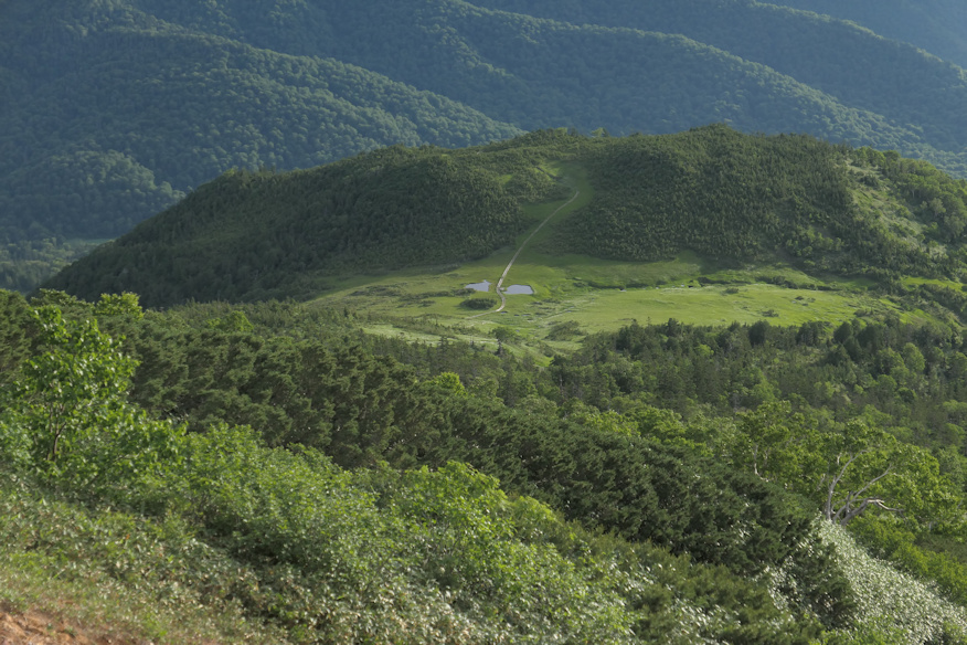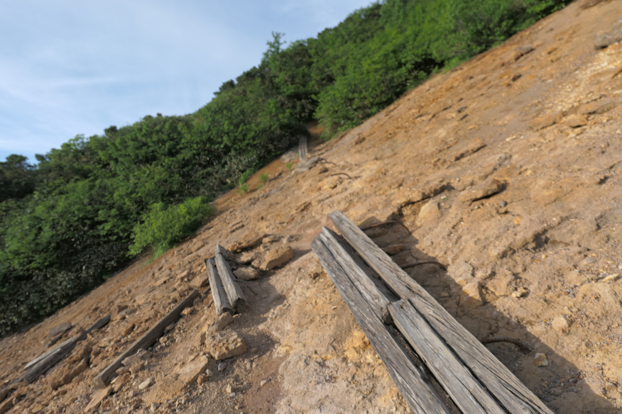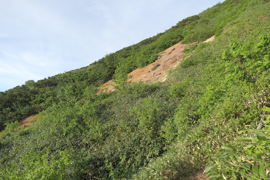 ![]() 森林限界の上に出て一気に視界が開ける。眼下に広がるのは先ほど通過した熊沢田尻。かなりの規模の湿原であり、単純な低地ではなく、御覧ように向こうの尾根筋の途中まで続くのです。ホント、どうやって出来たんでしょうね、これ。 ![]() 間もなく8号目の表示。残り二つですが、この何合目は明確な基準があるわけではないので、どこまで当てにしていいのかは微妙。 ![]() その先で、下からも見えていた10円玉ハゲのような荒れ地に出る。土砂崩れがあったわけでも無さそうで、どうしてここだけ植生が無いのかよく判らず。豪雪地帯における森林限界付近の低木林なので、ちょっとした事で植生が失われてしまうんですかね。 ![]() 元は木道があったようです。ただし無くてもそれほどの危険性は無いので問題無し。 ![]() そこから東の方を見る。太陽がかなりの高度に登ってますがまだ午前6時前です。さすが夏至直前。まあ高度が高いというのもありますが。でもってこの方角にはここより高い山は一つも無いので全てを見下ろす形になります。なんか意味も無く偉くなった気がして気分がいいですね。人間性が驚くほど安いですね、自分。 |