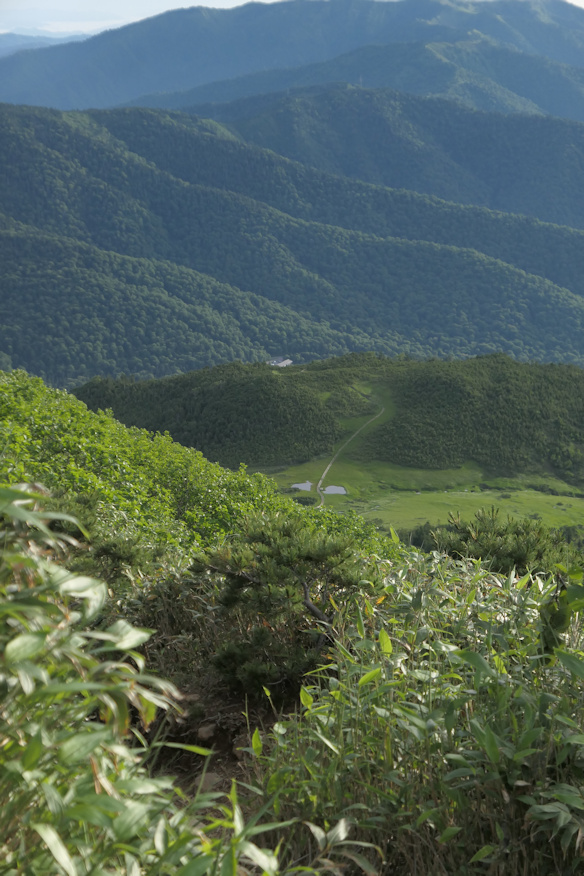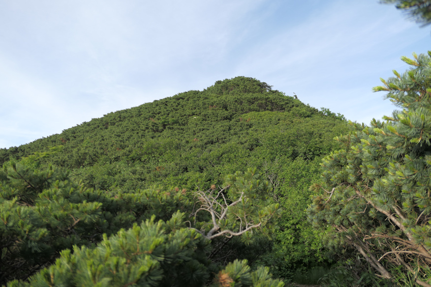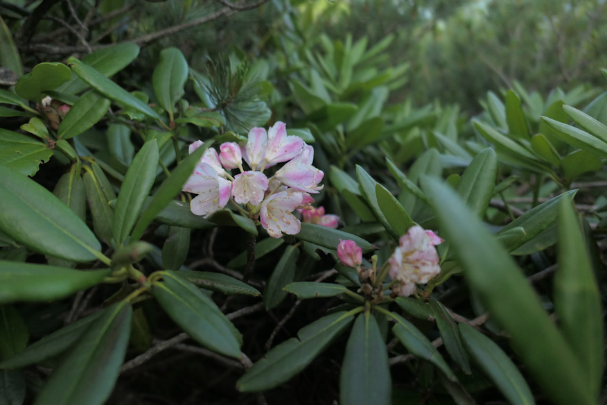 ![]() 無茶苦茶な急登坂だけあって、あっさり9合目まで到達。あとは頂上のみです。 ![]() そこから振り返ると、熊沢田代がさらに小さくなってる。その左上の建物はスタート地点の御池ロッジですね。ほぼ山頂付近からここまでの経路を一気に振り返る形に成っています。標高差でざっと700m、直線距離でざっと3.5km、よって斜面移動の距離はざっと3.6qというところでしょうか。 まあ羽田のC滑走路、成田のB滑走路と同じ程度の距離なので、出発点が見えても不思議は無いのですが、この高度まで来て出発点が見える山はあまり見た記憶が無く、ちょっと斬新な感じ。 ![]() いよいよ山頂が見えて来ました。二つある山頂の内、一つしか見えてませんが、あの上に出れば、もう一つも見えるはず。 ![]() 低木林の中に咲く ハクサンシャクナゲ。可憐な花です。20年ぶりくらいに見ました。そういえば昨年の男体山では見なかったな。6月だとまだ早かったか。 |