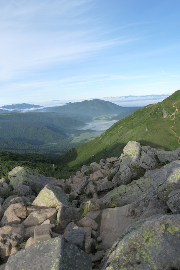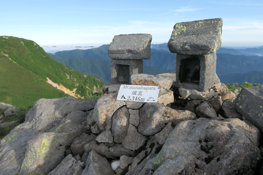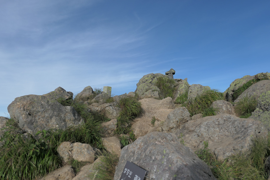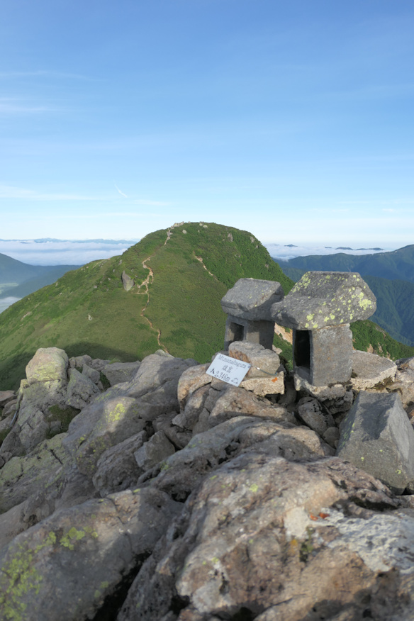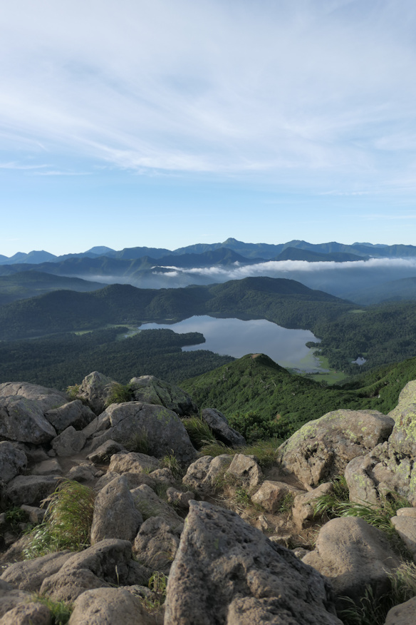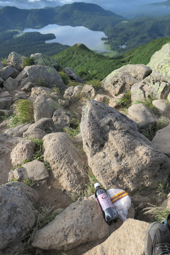 ![]() あ、あれが山頂か。現在午前6時ちょうどなので、ざっと3時間半かかっての到達です。でもって二つある山頂の内、どっちだここは。 ![]() 山頂には二つの石の祠がありました。ここも男体山などと同じく信仰の山だったのかな。以前も書いたように尾瀬沼の横には古い街道が通ってましたから、それなりの歴史はありそうです。 でもって、そこにあった標識でこちらは俎ー(まないたくら)だと知る。あれま、10mほどの高低差ですが、とりあえずこちらは最高地点ではないですね。この辺りややこしいのですが、山全体の名前が燧ケ岳で、山中の頂にはそれぞれ別に名があり、俎ー(まないたくら)、柴安ー(しばやすくら)、赤ナグレ岳などと呼ばれます。 ![]() となると向こうに見えているのが燧ケ岳の最高地点である柴安ー(しばやすくら)か。…登るのか、あれを。また…。 燧ケ岳の山頂部は凹型の双子峯なのですが一帯は元は噴火口で、崩壊した結果残ったのが今の地形らしいです。とりあえず男体山と言い、この一帯の山は自らの噴火口を吹き飛ばしてしまう大規模噴火が多いですね。 近代になってから大噴火は無く(ただし江戸期初期、1600年前後に溶岩ドームの隆起がありそれが現在の赤ナグレ岳らしい)、気象庁の警戒レベルでは1、活火山である事に留意とだけされています。ちなみに現状、目で見える火口は存在しません。ただし尾瀬の沼と湿原を造る事になった大量の堆積物を産んだのがこの山なので、元は結構な火山だったと思われます。その尾瀬沼を産み出した噴火があったのがこの一帯の火口と見られているのです。 ![]() 2023年の訪問時に尾瀬沼南岸から見た燧ケ岳山頂部。左端の赤ナグレ岳も山頂の一部に見えますが、実際は手前に位置するからそう見えるだけで、約100mほど低い位置に在ります。この三つの頂周辺がかつての噴火口で、これらが噴火して手前のV字谷に沿って溶岩流が流れ込み、一帯の川を堰き止めて尾瀬沼と尾瀬ヶ原が出来たと見られています。 ついでにこの写真で見ても赤ナグレ岳の下辺り、2200m前後が森林限界で、そこから上は低木林になっているのが見て取れますね。 ![]() 少し進むとチラリと尾瀬ヶ原が見える。これも上から見るのは初めて。まだ靄が掛かっています。 ![]() でもってここまで来ると尾瀬沼が完全に視界に入る。奥に日光白根山と男体山から続く日光連山も見えて、いやはや絶景ザマス。ここで朝食としましょうか。 ![]() 銀河の甘露、ドクターペッパーとマクドナルドで買っておいたダブルチーズバーガーの朝食。私の登山史の中ではトップクラスのご馳走です。山頂で食べる食事は旨いとか、コーヒーは最高、とか言う人間を筆者は全く信用しないので、これで十分。私は山に登ってその風景が見たいのであって、飯を食うために来たのではないのだ。 ちなみに尾瀬沼の手前にテッペンが剥げている突起部が見えてますが、あれも噴火口の一部だった場所じゃないかなあ。ただし頂点が剥げているのは登山路の休憩所があるからで噴火口とかでは無いです。 |