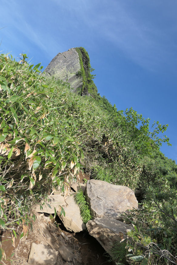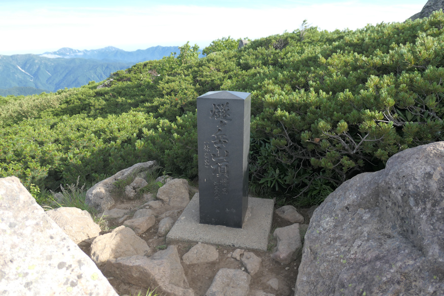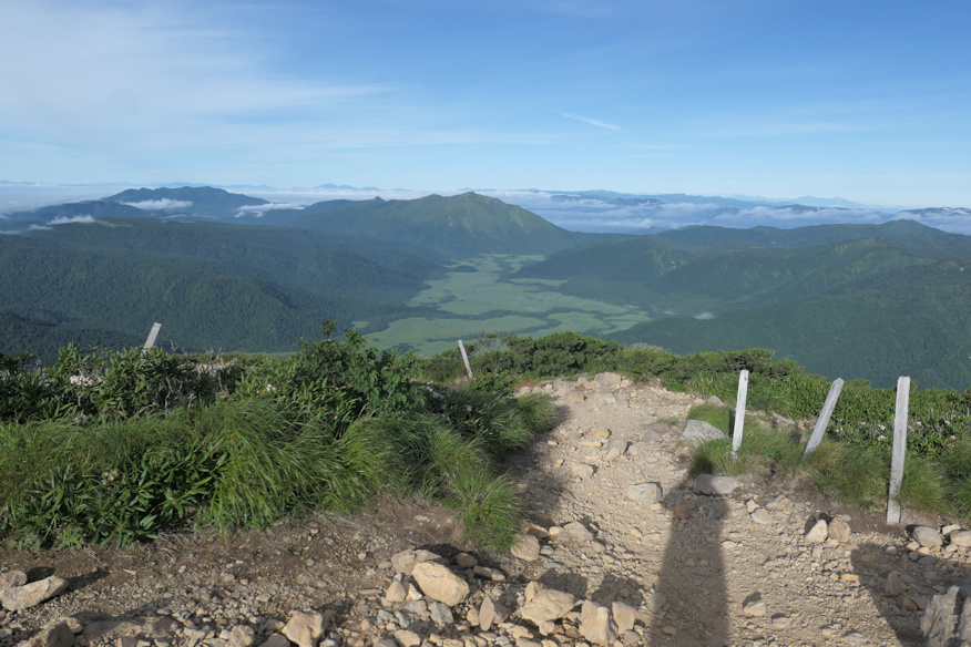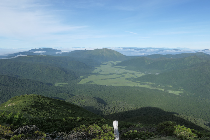 ![]() ではいよいよ燧ケ岳の最高峰、柴安ー(しばやすくら)を目指して最後の登坂を開始します。まさか最後の最後に50mの逆直滑降登坂があるとは思ってませんでした。でもって当然、もう一度これを下って、再度俎ーにも登らないと下山が出来ないわけです。すなわち合わせて100mの上り下りがまだ待っているわけで…。 正直、ゲンナリですがここまで来たのだから一気に片づけるとしましょう。 ![]() 一帯は低木林に囲まれていますが、ところどころにこういった岩場があります。中でも目立つあの大きな岩は何か名前がありそうですが、確認できず。というか、あの巨大な岩の上にまで緑が植生しており、自然の力すげえなと思う。 ![]() ようやく山頂に。登ってしまえば15分ほどの行程でしたが、体力の消耗はかなりのもの。この高度ではそこまで空気は薄くないはずですが、多少は影響あるか。ただし山頂にあるはずの2356mの三角点が見つからなかったのですが、まあこの辺りが山頂と判断していいでしょう。ここより高い場所はありませんので、男体山みたいにどこが最高地点なのか迷う事は無し。 ついでにこの墓石並みに重そうな山頂の碑、ここまでよく運んだな。事実上の拷問でしょう、それ。中は空洞で軽い、実はプラスチック製、これのためだけにヘリを呼んだ等が考えられますが、正解は不明。 ![]() その下に展望台のような場所があり、そこから尾瀬ヶ原が一望できました。 ![]() 尾瀬ヶ原から至仏山、そして左端に見える武尊山まで一望に出来る。いや凄い光景だな。視界に入るのはひたすら緑の大地のみです。チョーステキ。 |