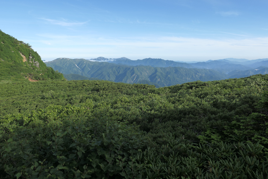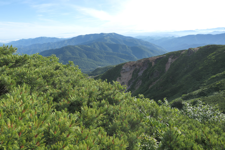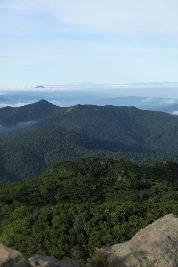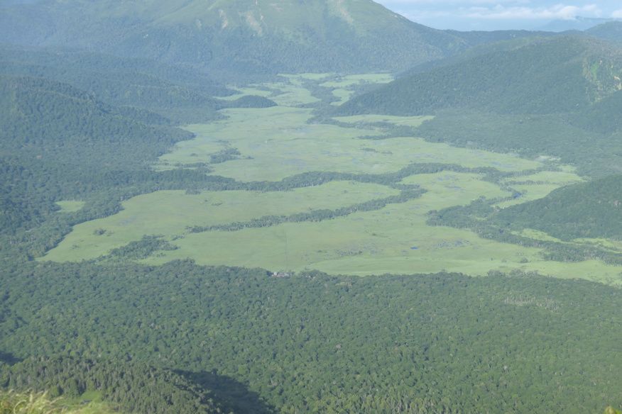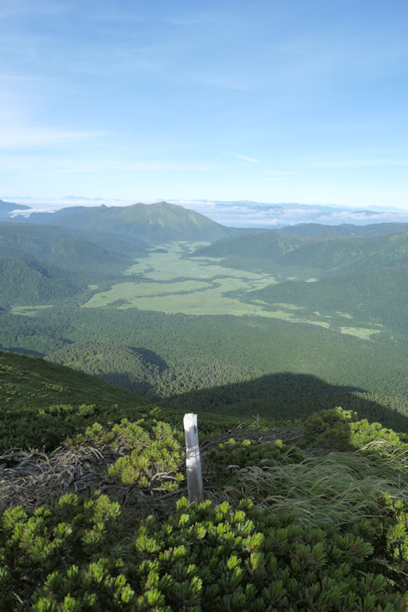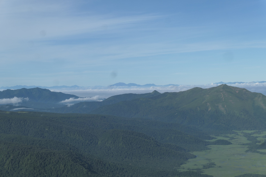 ![]() しばらくその風景をただ呆然と眺める。来てよかったなと思う。 ![]() でもって今自分が居る場所が燧ケ岳の山頂であることがハッキリしているので、はるか向こうに見える山の判別も簡単です。地図上で直線を引けばいいだけなので。よって画面中央付近、至仏山(右端)と武尊山(左端)の間にそそり立つ山は浅間山、2568mだと簡単に判断できます。この山も見る角度でかなり形状が異なるのですが、この方法で確認すれば確実なのです。ちなみに軽井沢の北に位置する浅間山まで約95qあるんですが、ハッキリ見えるんですよね。これが高山の凄い所です。 その左手、武尊山の背後に隠れるように見えているのは地味に高山ながらあまり有名ではない蓼科山、2530mの尾根筋だと思います。その向こう側に広がる蓼科高原が有名ですが、蓼科山の背後から横岳(八ヶ岳じゃ無い方の横岳)までの尾根筋は2400m級の縦走路になって、それなりの山なのです。人気無いけど…。その蓼科山は一度、例の友人に連れられて登ったのですが、山頂付近が岩とガレ場だらけで苦労した記憶があり。ちなみに筆者が高度2500mを超えた最初の山でもあります。 そういや二人で山頂から周囲を見回して、目についた山を次の目標にしてたんだよな、と唐突に思いだす。両者とも渋滞する道路と人の多い場所が嫌いだったので、飛騨、木曽、明石の三大山脈は最後まで一緒には登らなかったなあ。八ヶ岳だけは北半分の縦走をやりましたが、あれが二人で行った最後の山だったはず(ちなみに南半分は後に一人で歩いてる)。ちなみに現在その友人は行方不明です。いろいろあって(ケンカとかではなく向こうの家庭の事情)、現状は音信不通のまま。実家の電話番号は知ってるはずなので、その内連絡が来ると嬉しいなと思っております。 ![]() 尾瀬ヶ原をやや望遠で。湿原の中を走る樹林の道は川が流れている場所です。画面右端、北側の山沿いを画面奥から手前方向に向けて走るのが尾瀬の代名詞とも言えるヨッピ川、手前で湿原を分断するように走るのは沼尻川。両者が合流して只見川となり画面右下から流れ出ています。ちなみに沼尻川の奥にもう一本、下ノ大堀川が画面左右方向にに流れているのですが、なぜかこの川の周囲には樹林がありませぬ。 ちなみに手前から一番奥の湿原まで直ぐそこに見えますが、実際は約6qあります。秋葉原〜新宿、池袋〜原宿、大阪駅〜通天閣にほぼ等しい規模なのです。高低差は小さいですが、普通に歩いても縦断だけで1時間半コースでしょう。かなりの規模なのよ、尾瀬ヶ原。 ![]() そこからも御池のロッジが見える。画面中央付近にあるんですが、判りますかね。そして登山路を外れると、やたらと崩壊してる尾根筋が多いのにも驚く。男体山もそうでしたが、やはり火山だといろいろ脆いのだなと思う。 ![]() 北西側の眺め。画面左手に見える高い山は景鶴山 2004m(左)と与作岳(1932m)だと思うんですが確証は無し。 ![]() 薄っすらと富士山も見えてました。画面中央付近に居るの、判りますかね。その手前左で雲海から顔を出してるのは恐らく赤城山1828mだと思います。この方向から見たこと無いので断言はできませんが、富士山との間で高い山はそれしかないので。さらにその手前で尾根筋から飛び出しているピラミッド型の山は荷倉山2024mでしょう。これも経路が限られる幻の山の一つですが、あの裏を通るのが2023年に利用した大清水経路となります。 |