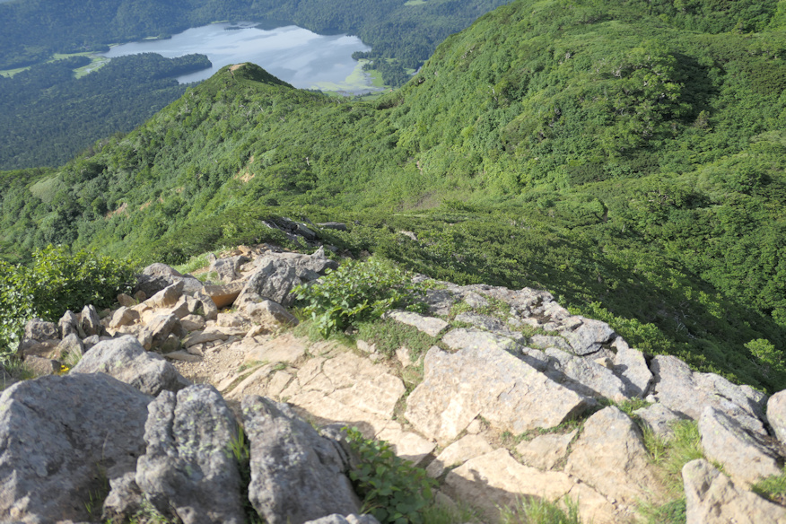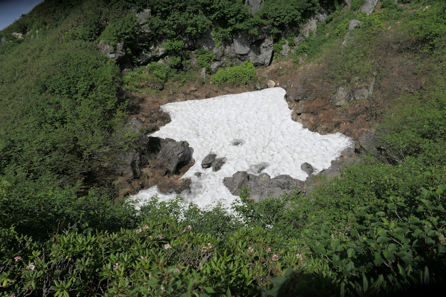 ![]() その途中で赤ナグレ岳こと御池岳の全景が見えました。中央付近の陥没した場所に小さな池があるはず。ただしそれが火口跡ではないようです。そもそも噴火口はもっと低い地位置に在り、その後、噴火を伴わない溶岩ドームとしてここまで隆起したと考えられているようです。 ![]() さてこの下は何でしょう。 普通に考えると断崖絶壁ですが、正解は登山道でした。これ、下るのも大変ですが、登るのはさらに大変そう。まあ四つん這いに近い形に成りますが、徒歩での走破は可能なんですけどね。ちなみに、こちらは尾瀬沼から上がって来る経路となり、御池側から登るより高低差が約130m少ないため(ざっと30階建ての高層ビルに近い)、人気があるようです。それでも決して楽では無さそうだなあ、と思う。こちら側も中級以上の経路でしょう。 ![]() そこから振り返る柴安ー。さらば燧ケ岳最高地点。あなたはとても素敵でした。 ![]() こちらは俎ー。手前に見えているのは尾根筋で、頂点となるのは右奥に見えている岩場の辺りです。 ![]() その途中で別の雪渓を見る。ええ、ここ完全に南向きの尾根筋なんですが。余程の積雪があるんでしょうね、この一帯。 |