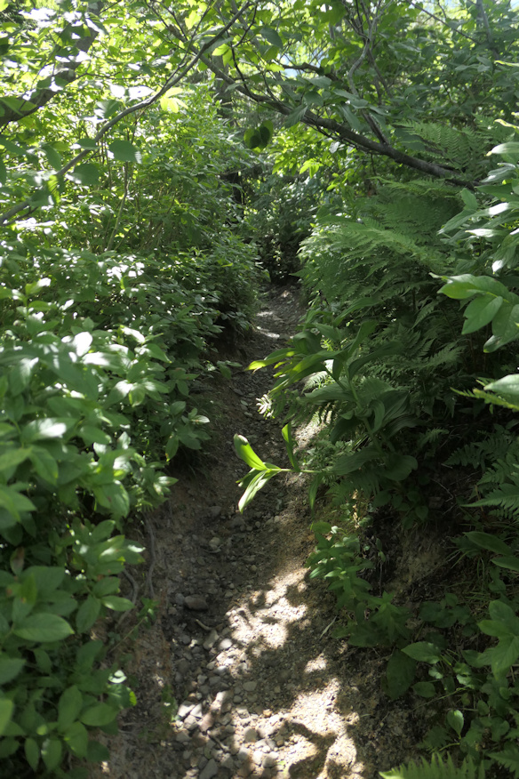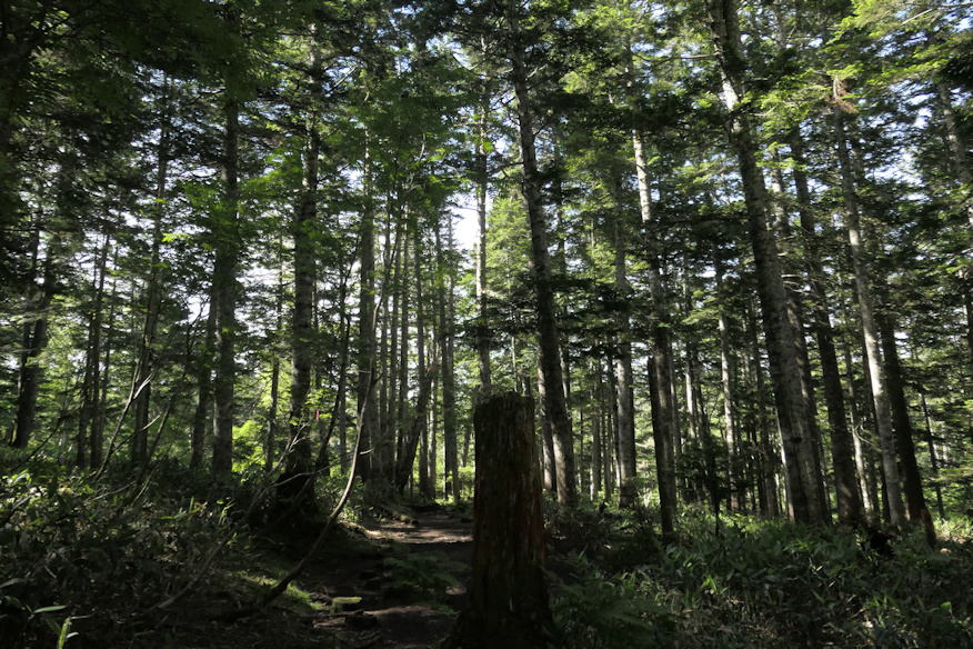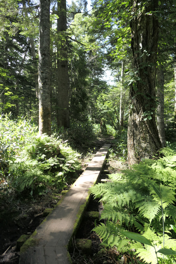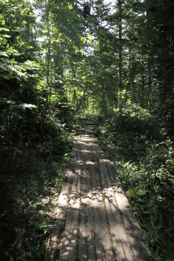 ![]() そこから先は完全に森林地帯に戻るので、木漏れ日の中をひたすら高度を落とす行程になります。でもってこの下山途中に50人近い人とすれ違う。途中までは数えてたんですが、あまりに多いので止めてしまう(笑)。2000mを超える山の登山路で、これだけ人とすれ違ったのは初めての経験でした。なるほど、ここは尾瀬なのだと思う。 ![]() 恐らく新道の方に入ったようで、かなり長いダラダラとした下り道が続きます。ざっと2時間近く歩いて、ようやく水平な道になる。間もなく沼だと思ったんですが、この後もしばらく歩く事になったのでした。 ![]() 途中から整備されたばかりの木道に。さすがに今度こそ沼だろう。 ![]() ようやく見えて来ました。以前にも書いたように沼は標高1665m前後あるので、登坂開始の御池より130m近く高い場所に降りて来た事になります。ならばこの後もずっと下りか、というとそう話は単純で無いのが山なのよ。 ![]() 沼周辺の整備された木道に出ました。このまま進めば大江湿原のハズ。 |